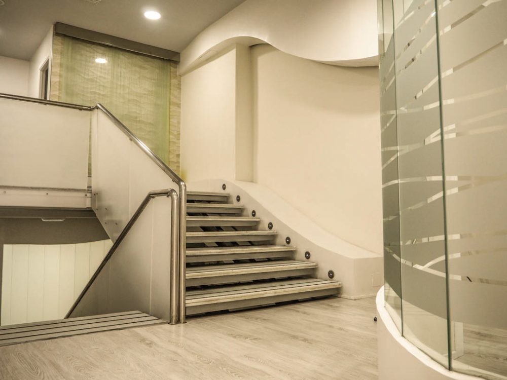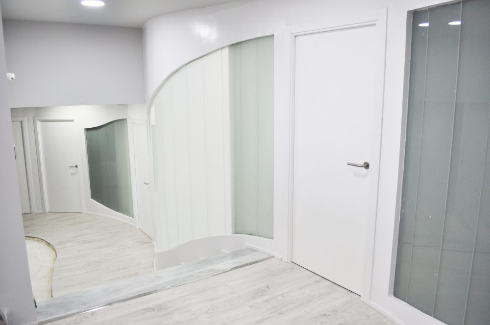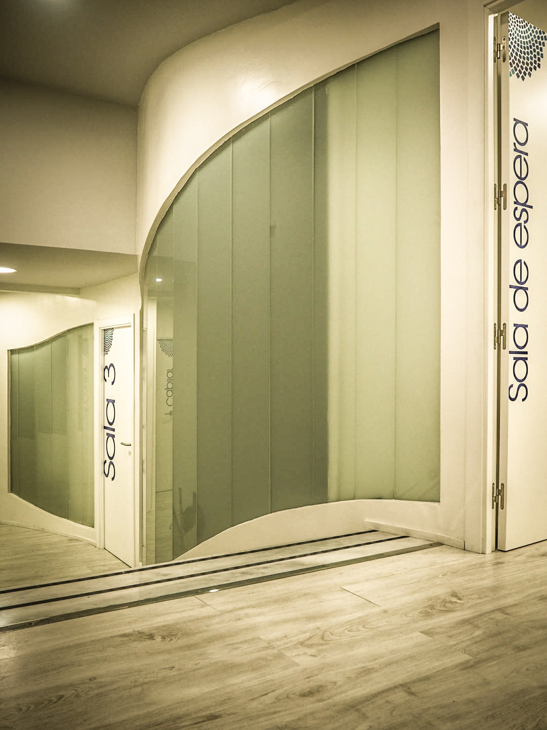 La curva predomina y se entiende por todo el local desde el propio mostrador hasta los gabinetes de tratamiento, haciendo función de sala de espera, consultas, oficina, estanterías… todo bajo una misma solución constructiva que por su movimiento hace cambiar el entorno y los usos. La fachada, simple y cargada a la derecha, con un parasol recortado, marca la diferencia de la zona y da un guiño a la parada de rigor del expositor, dejando libertad al acceso del mismo para que la entrada quede sin reguardo. Predominio del color blanco y arenoso. Cascadas de agua en su interior combinadas con vegetación, le dan una armonía especial al lugar.
