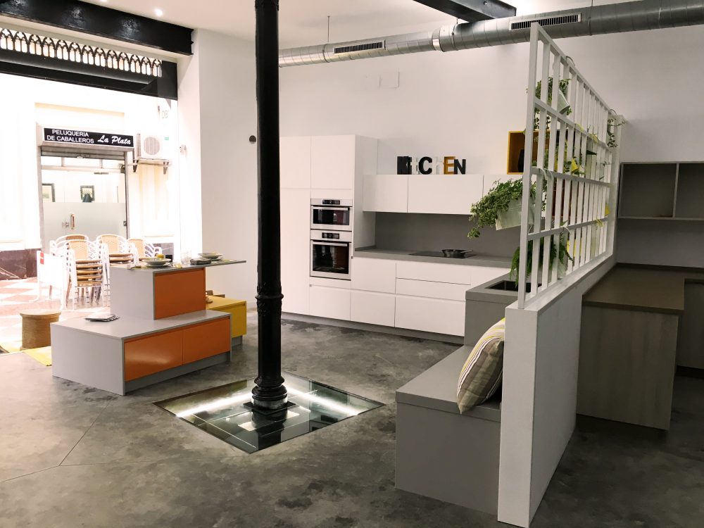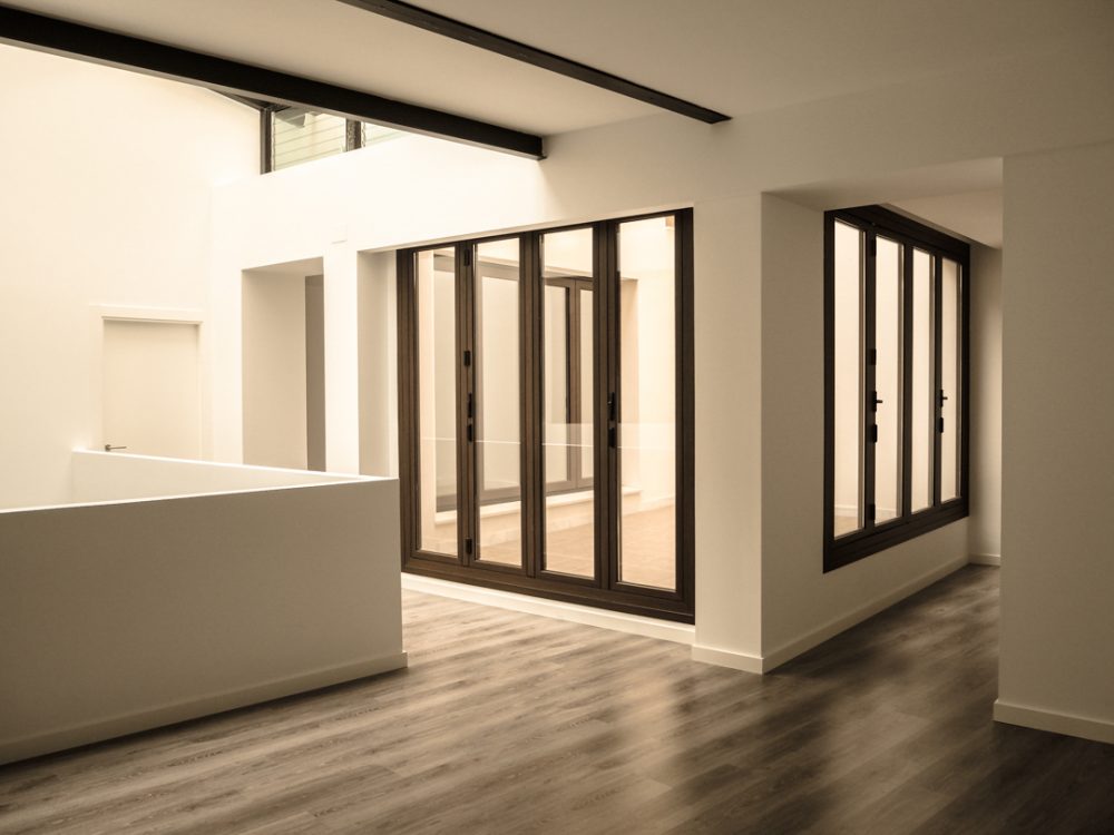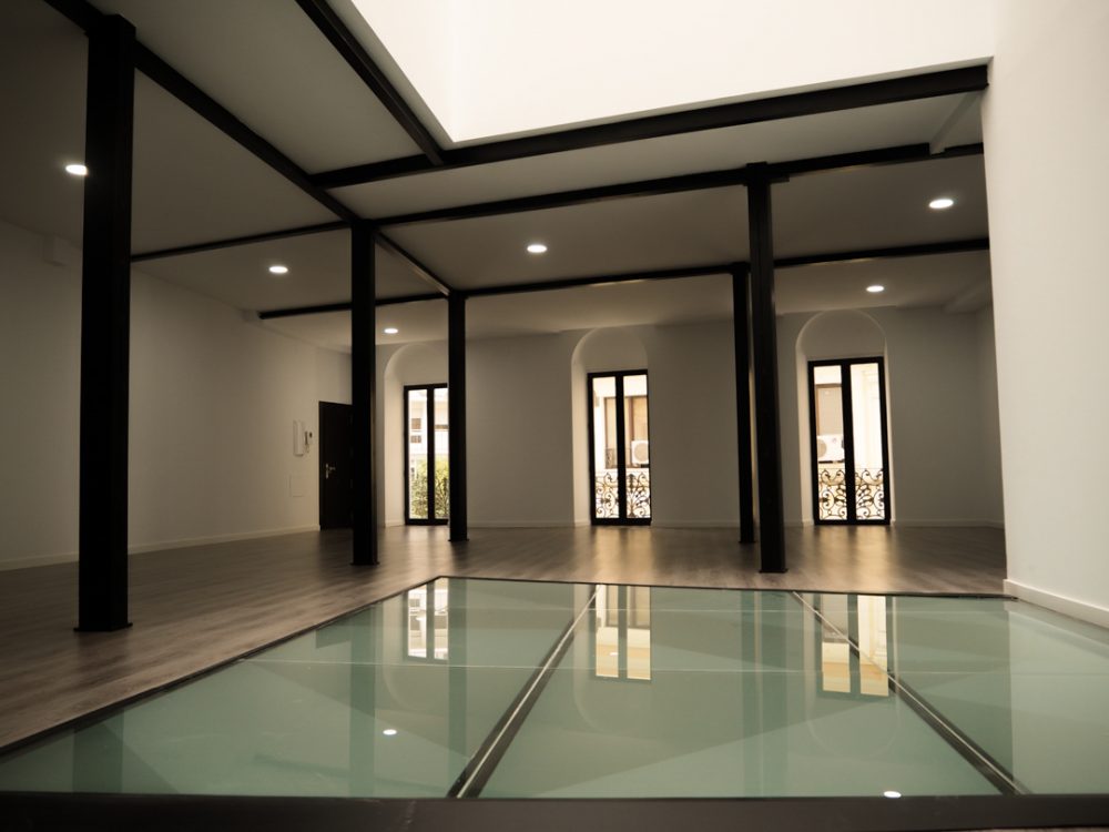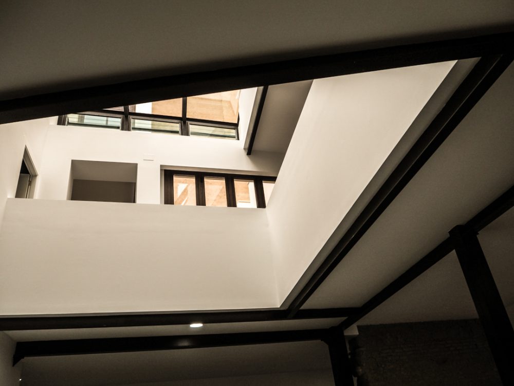 De esta forma, se conserva los elementos y huecos de la fachada, resaltados por un nuevo acabado de color blanco; se repara los elementos constructivos caracterÃsticos del interior del edificio, como los pilares de fundición y su cimentación, quedando en la propuesta totalmente vistos al configurar la planta de forma diáfana.