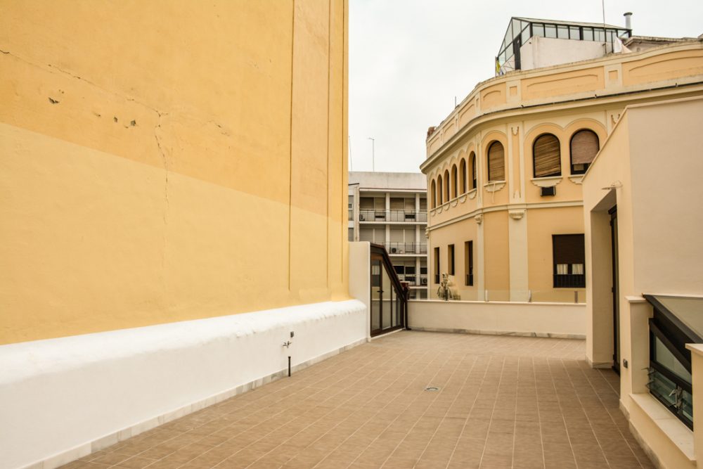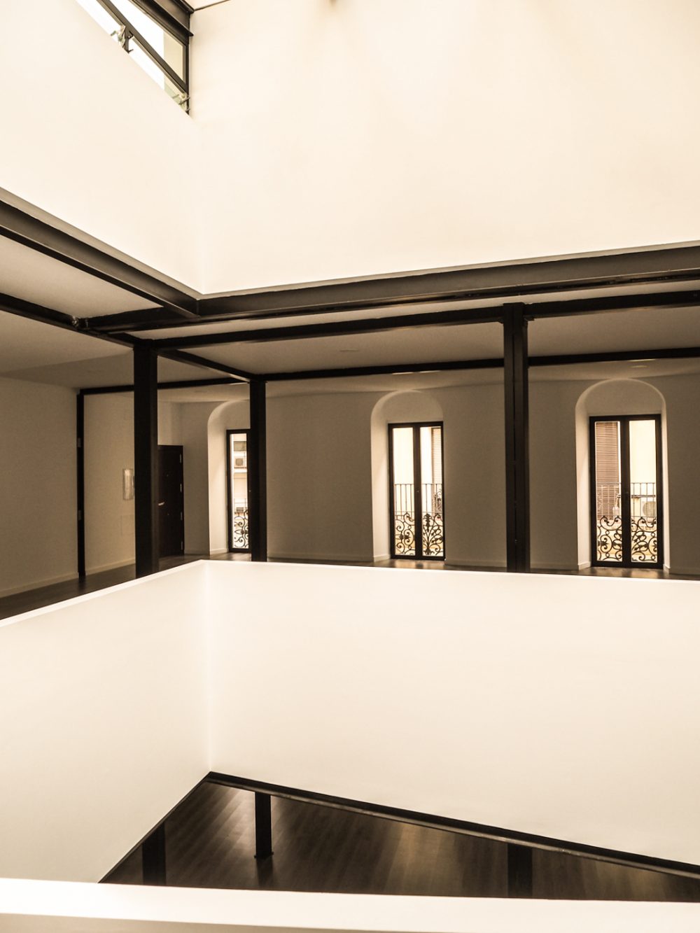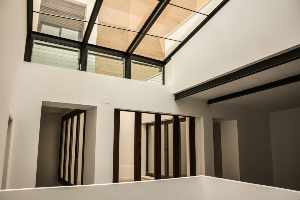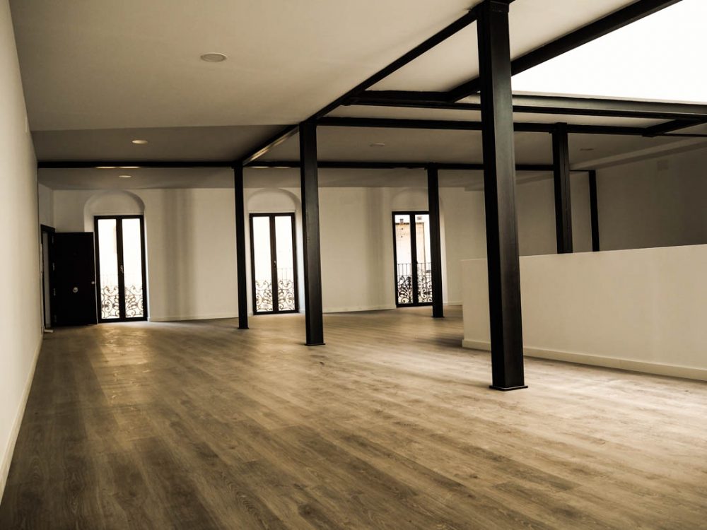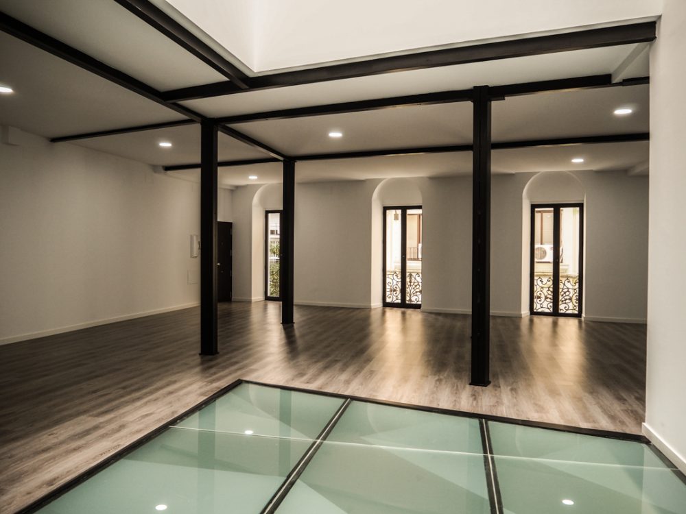 De esta forma, se conserva los elementos y huecos de la fachada, resaltados por un nuevo acabado de color blanco; se repara los elementos constructivos caracterÃsticos del interior del edificio, como los pilares de fundición y su cimentación, quedando en la propuesta totalmente vistos al configurar la planta de forma diáfana.