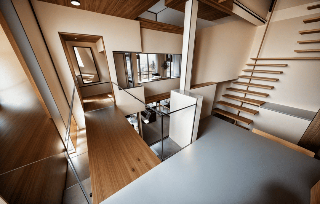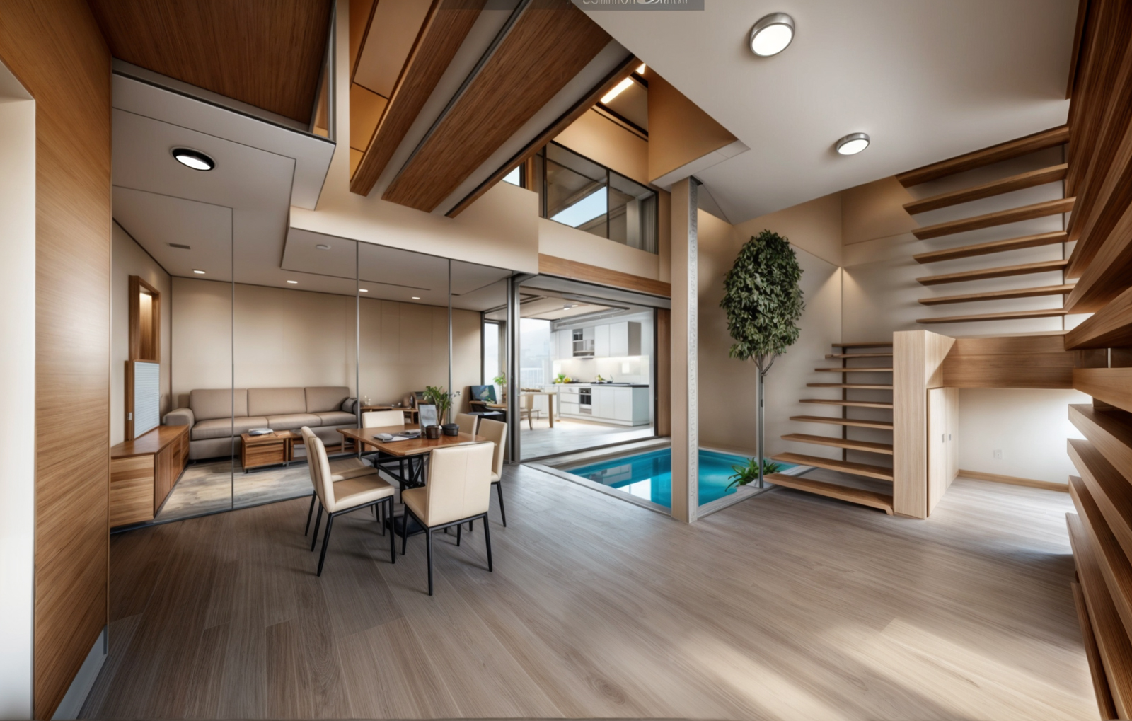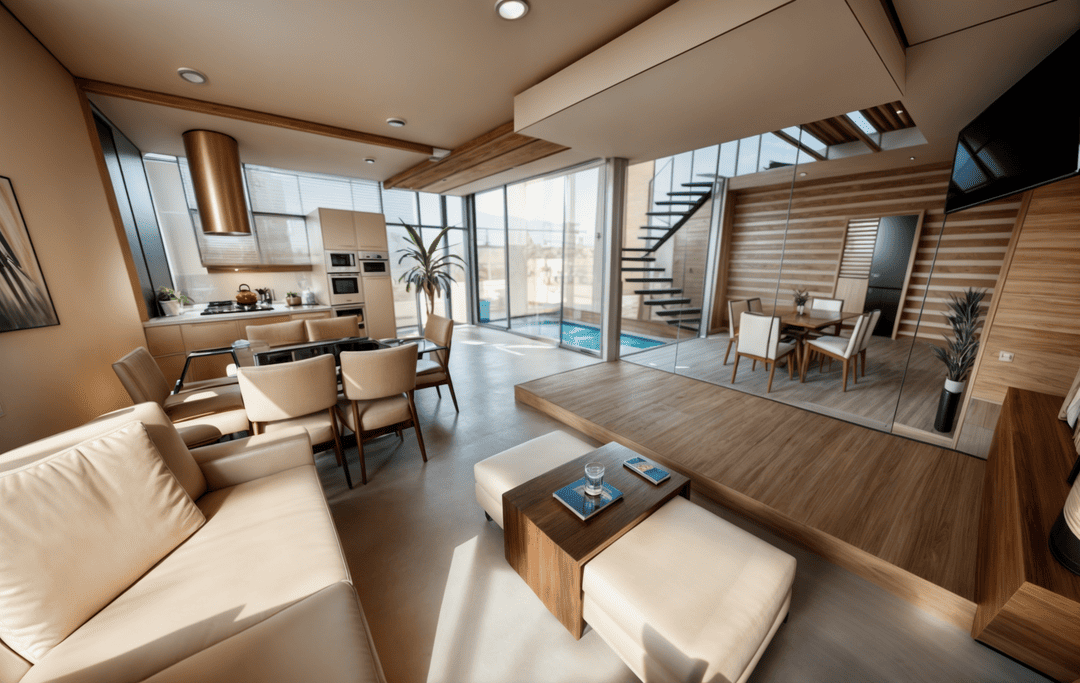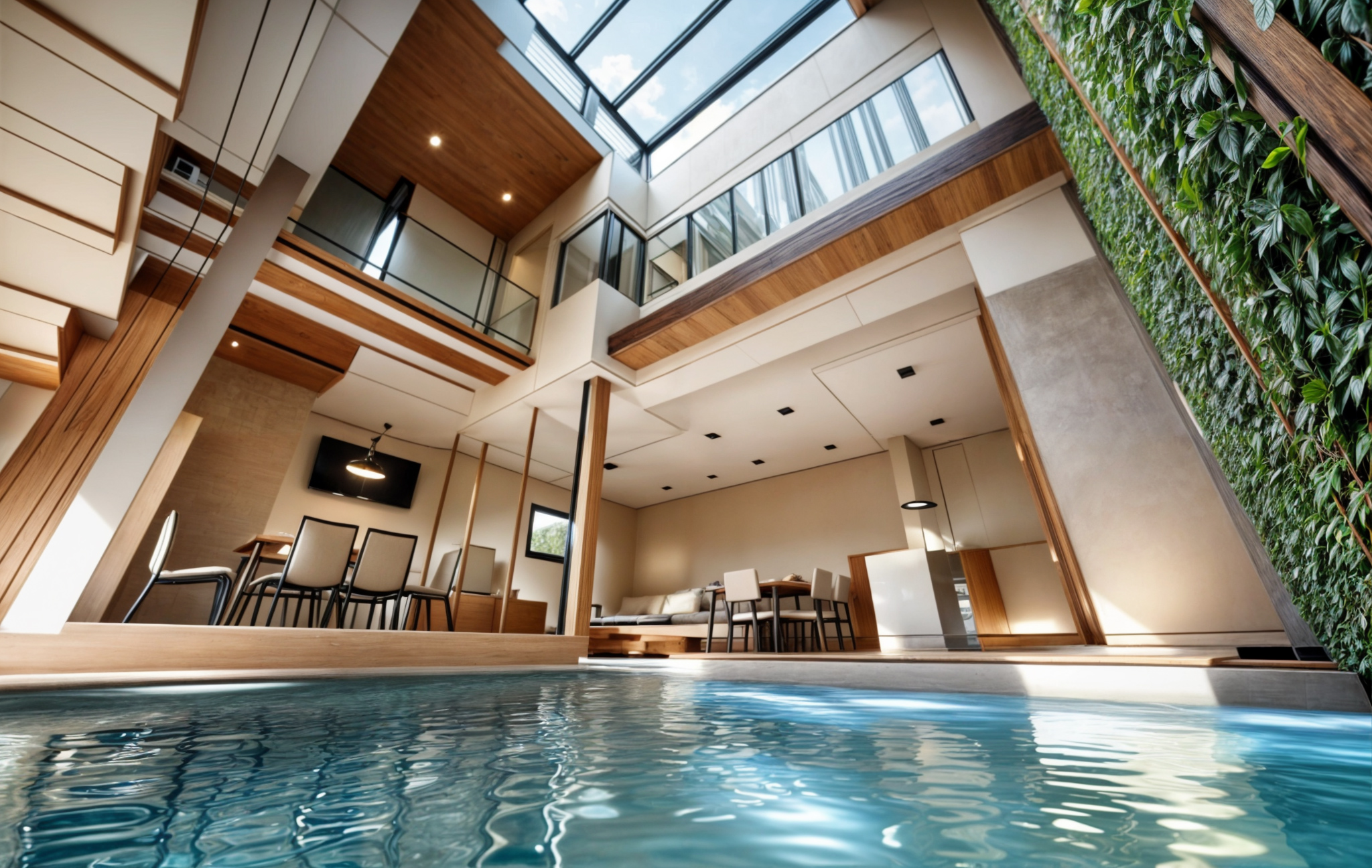 La casa se organiza en dos plantas alrededor de una impresionante piscina central, creando una conexión fluida entre los espacios interiores y exteriores.